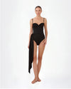 The Rafaela one-piece stands out with its sweetheart neckline and subtle draping that delicately enhances the silhouette. Gold appliqués lend a romantic touch, while the long side tie gracefully wraps around the waist, creating a lengthening, sophisticated effect.